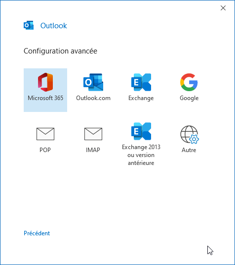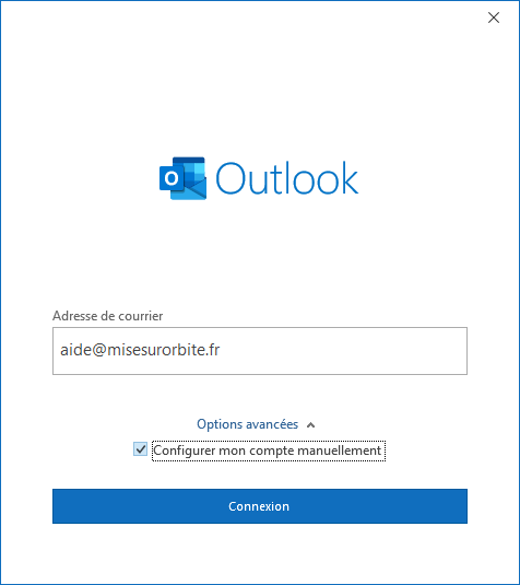 Saisissez votre adresse email, cliquez sur Options avancées, cochez Configurer mon compte manuellement et cliquez sur « Connexion » :