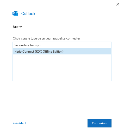 Choisissez Kerio Connect (KOC Offline Edition) et cliquez sur « Connexion » :